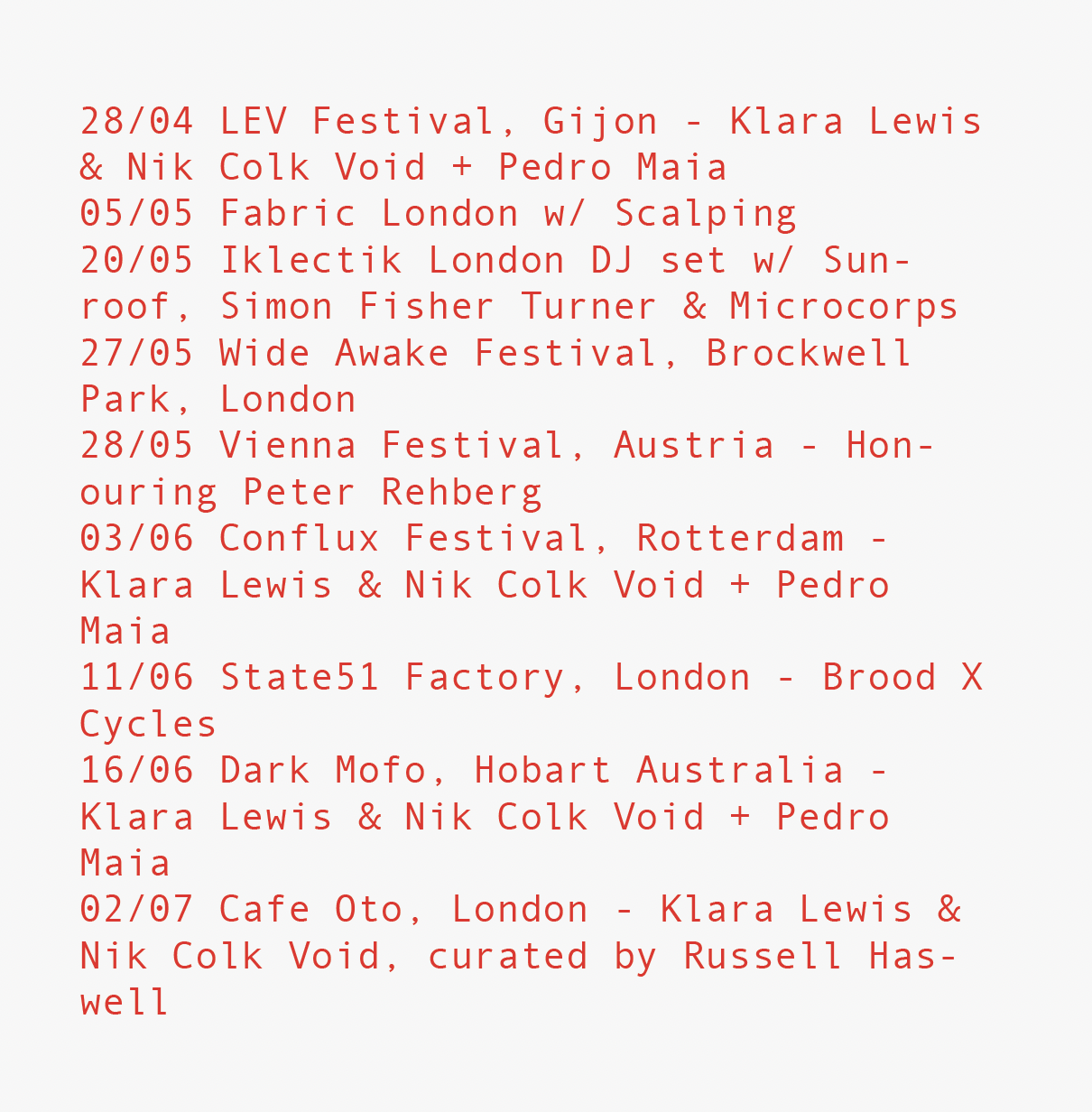 Gijón/Semibreve Braga/Villette Sonique Paris/Supersonic Birmingham/Grauzone The Hague/Equity & Exchange New Mexico/London Spitalfields Music Festival/All Points East Festival London/ Japan Fuji Rock Festival/Rewire Festival The Hague/Skanu Mezs/London Fabric/London Iklectick/London Wide Awake Festival/London Field Day/Cheshire Blue Dot/London Corsica/Vienna Festival DazWerk/Conflux Festival/London Cafe Oto/London Village/ London Oslo/London Oval Space/London Village Underground/London Electrowerkz/Montreal Mutek/Gallery 1986 Vilnius/London FOLD/Mexico Mutek/Sheffield DINA/Walthemstow Trades Hall/Berlin Kiezsalon Akademie der Künste/Luxembourg Rotondes/Brussels le Nuits Botanique/Tresor Berlin/Sonar Barcelona/Primavera Barcelona/Robot Festival Belogna/Donau Krems/Fiber Amsterdam/The Blitz Munich